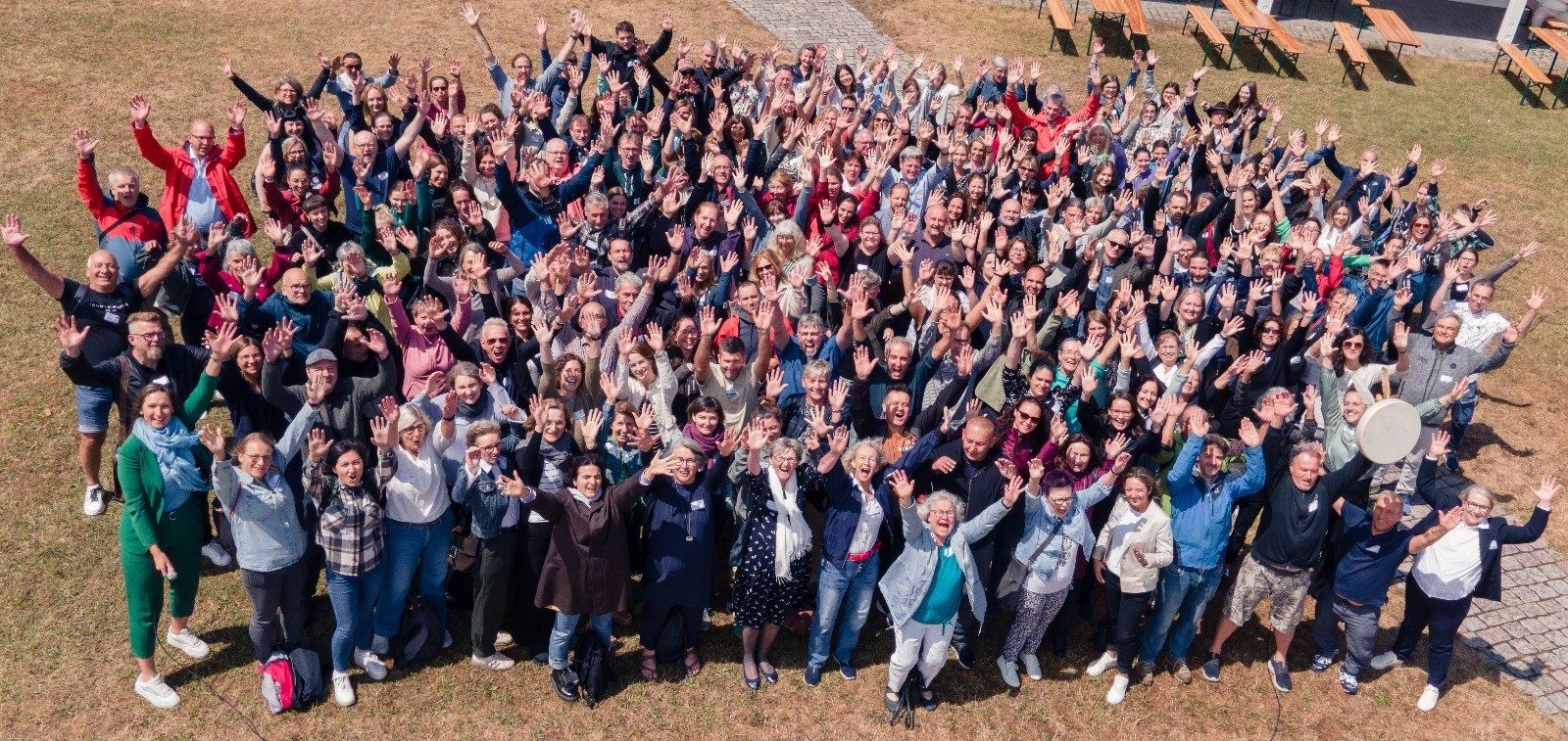 79. Josh_Sorenson-Prexels – Menschenmenge in einem Stadion mit Nahaufnahme einer Frau von hinten, die die Hand zum Winken hebt